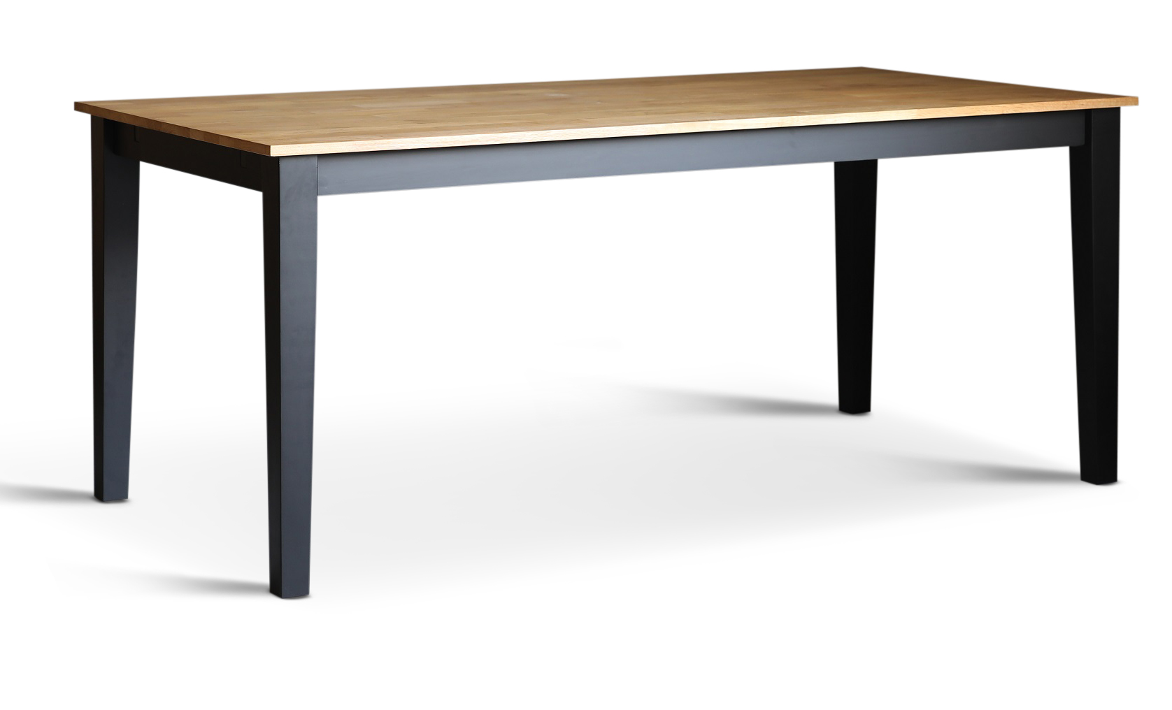 Dalsland matgrupp med stort och bra matbord med toppskiva i oljad ek och svartlackat underrede. 6 st klassiska Dalsland pinnstolar i duvblålackat massivt trä.