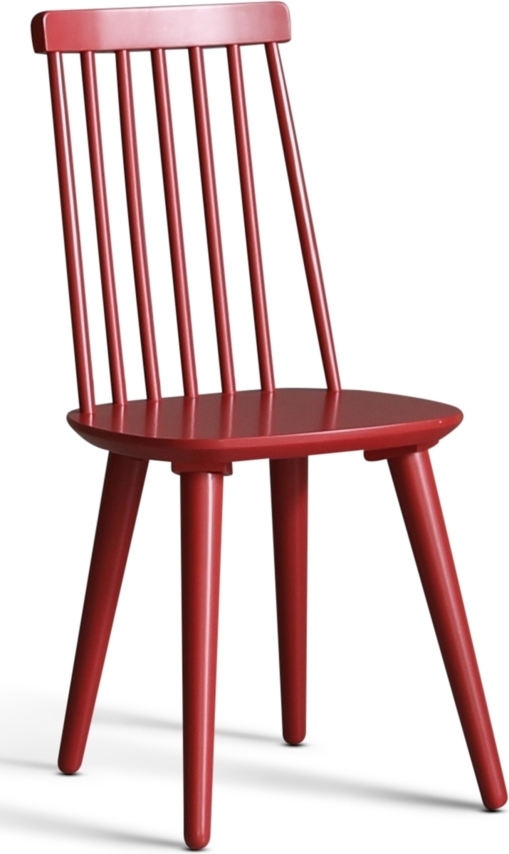Dalsland matgrupp med runt matbord med toppskiva i oljad ek och vitlackat underrede. Dalsland pinnstolar i en läcker röd lack (RAL3003)