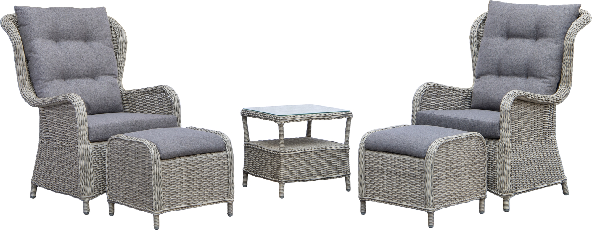 Utemöbelsetet består av 2 st bekväma fåtöljer med matchande fotpallar och ett sidobord samt dynset. Möbelsetet är tillverkat i aluminiumram med grå konstrotting och grå dynor. Rundad exklusiv konstrotting för rätt kvalitetskänsla. Sidobordet har en skiva av tempererat glas.