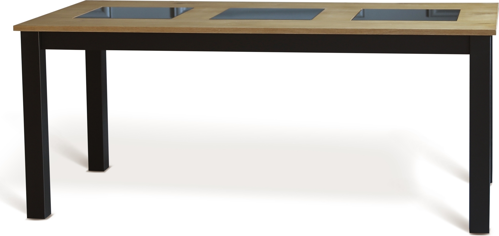 Matgrupp med matbord och 6 st stolar ur serien Texas och Granit. Matbordet är gjort ek och fanèrad ek med svarta glasplattor. Stolarna är gjorda av metall med klädsel av konstläder(PU).