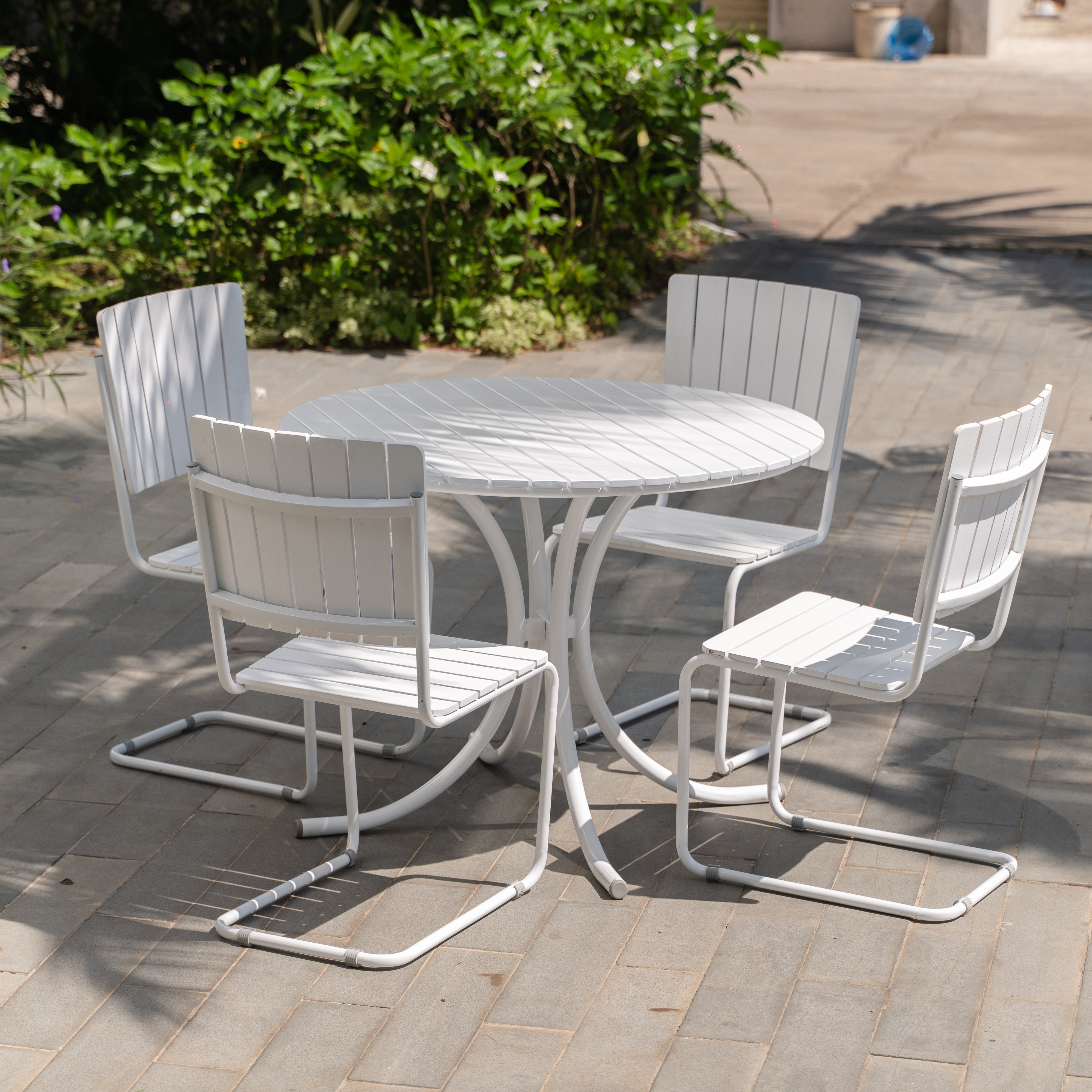 Utegruppen består av ett runt bord 103 cm i diameter med tillhörande 4 st stolar.