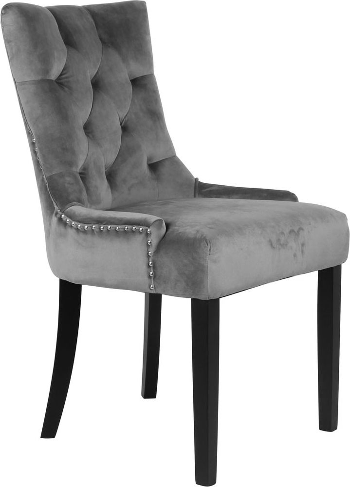 Medföljer gör också 4 st Tuva stolar i ett mjukt grått sammetstyg tyg med kromade nitar och ett rygghandtag som en fräck detalj. Stolen är välarbetad och en av våra mest populära matstolar till Vintage-stilen.