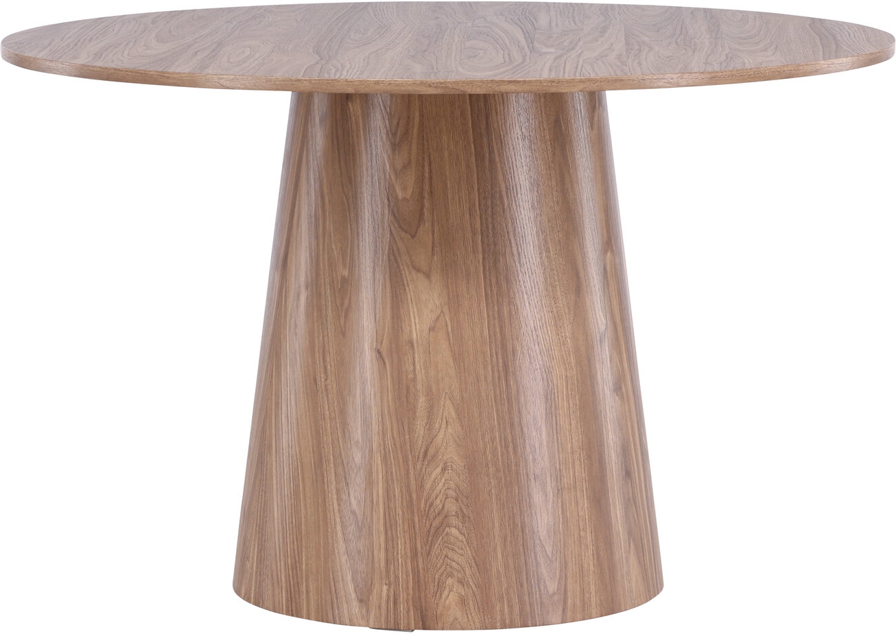 Matbord som imponerar med sin skandinaviska design och smakfulla utformning. Bordet är tillverkat i MDF och har en tunn, rund toppskiva tillsammans med en konformad stomme som är centrerad under bordets mitt. Den jordnära, valnötsliknande kulören framhäver materialets naturliga mönster och skapar ett levande uttryck med känsla av djup och rörelse. Ett stilrent blickfång för hemmets hjärta – här hamnar ingen på kanten.