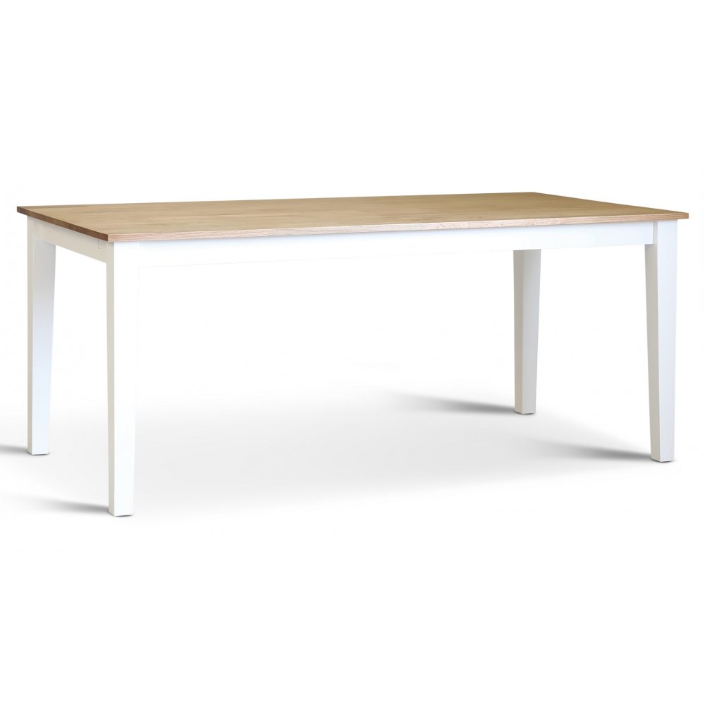 Matbordet har ett vitlackerat underrede som ger ett ljust och luftigt uttryck, medan bordsskivan i massiv, stavlimmad oljad ek tillför en naturlig värme och karaktär. Den rektangulära formen med raka linjer gör att bordet smälter in i både moderna och traditionella miljöer. För dig som vill ha extra plats vid större sällskap finns möjlighet att komplettera med tilläggsskivor (säljs separat).