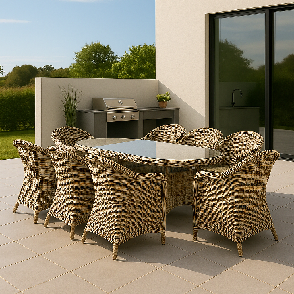 Skapa en trivsam plats för långa måltider och avkoppling utomhus med den här matgruppen i naturfärgad konstrotting. Bordet från Menton-serien har en bordsskiva i tempererat glas som ger en lättskött yta med plats för sex personer. De tillhörande Mercury-fåtöljerna har en klassisk design med välvd rygg och vadderad vit dyna som ger både stöd och komfort. Perfekt för både uterum och uteplats.
