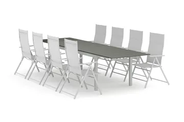 Tunis utomhus matgrupp förlängningsbart 205/305x90 cm med 8 positionsstolar, Vit/Grå