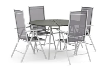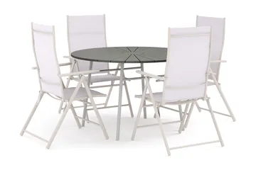 Tunis utomhus rund matgrupp 120 cm med 4 Maggie positionsstolar, Vit/Grå